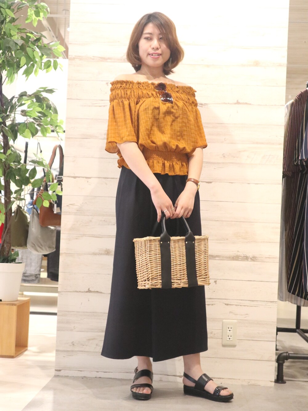 フォローいいねありがとうございます🎵 夏らしいオフショルダー&かごバッグのコーディネートです⭐️☀️