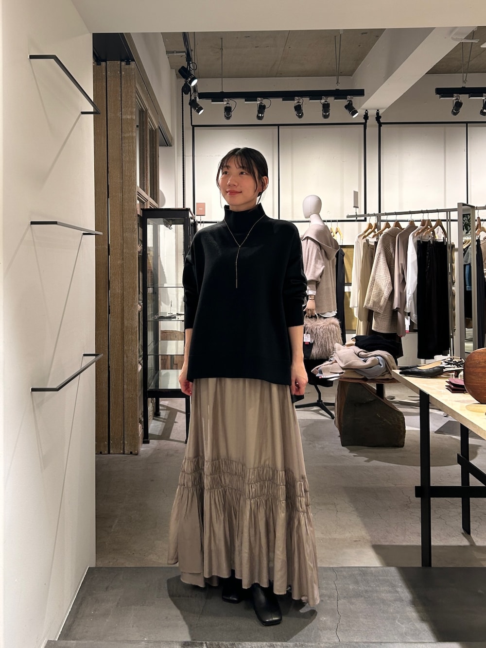 サイドにスリットが入っている為 オーバータートルはアウトスタイルも重たくならずに着ていただけます。 スカートは前後差があるので、簡単におしゃれなバランスになります。 どちらも軽い着心地で長い季節使っていただけます。