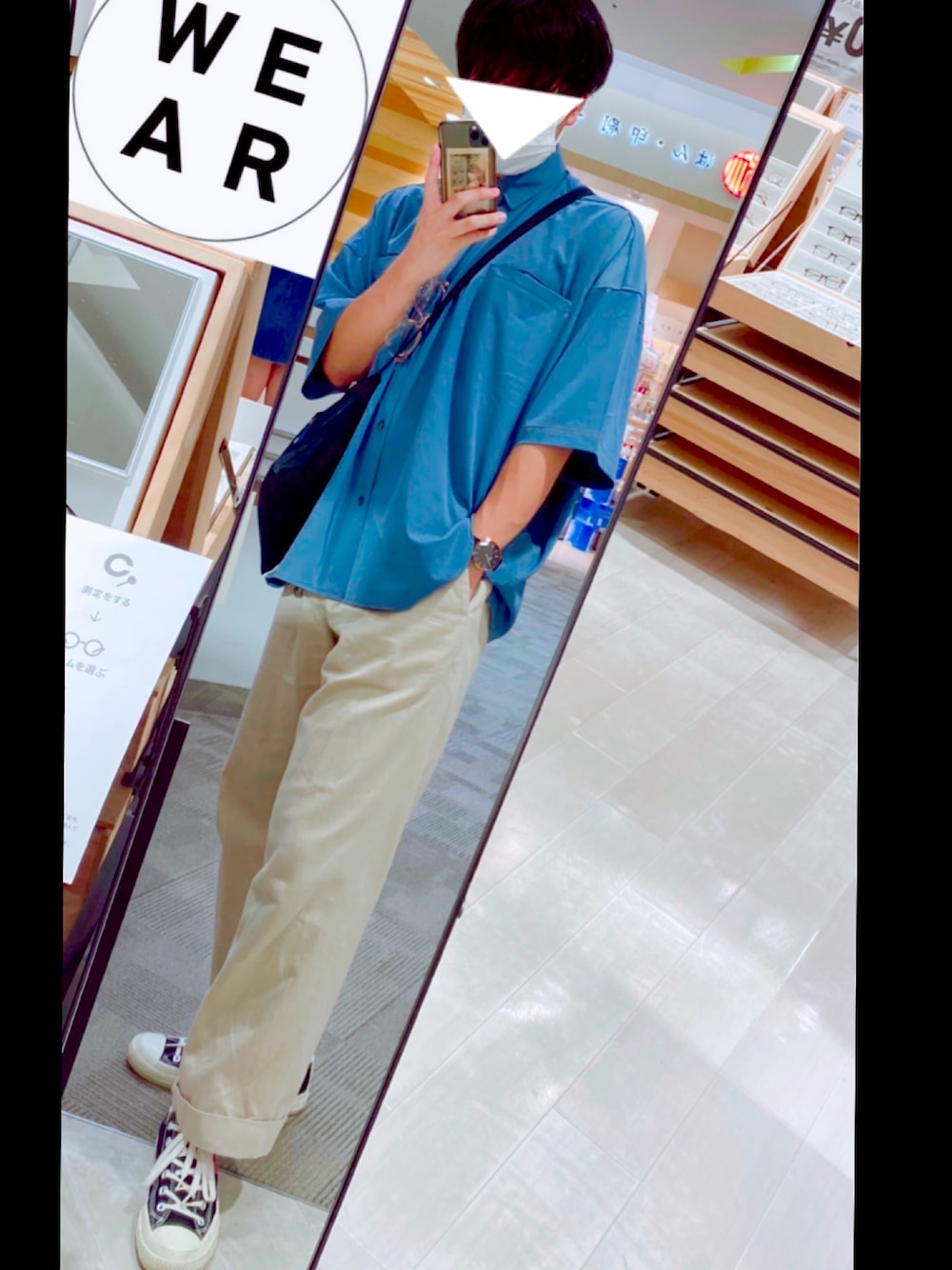 彼女とお揃いのメガネを作り待ち時間でパシャリ👓 . このトップスはとっしーさんのwear見て一目惚れして即買い! . パンツに合わせやすいし派手なブルーじゃないから最高に可愛い