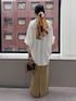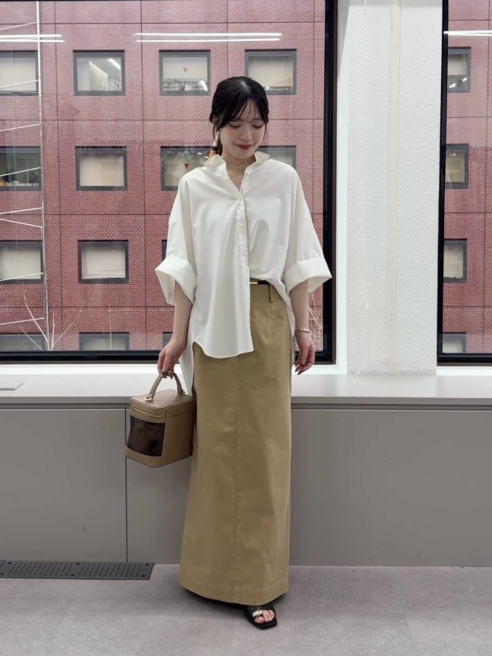 落ち感がある大人のオーバーシャツ。 肘まで隠れる長さなのが◎ チノスカートはとても柔らかく履きやすい! 小物で遊びをプラス♡