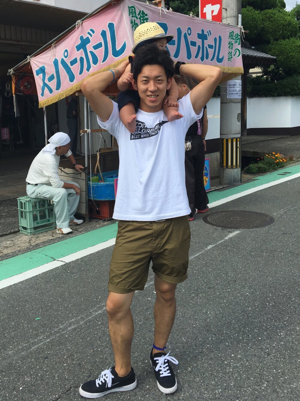 嫁の地元のお祭りに来ました! 暑い✨ やっぱtシャツ短パンが楽✨