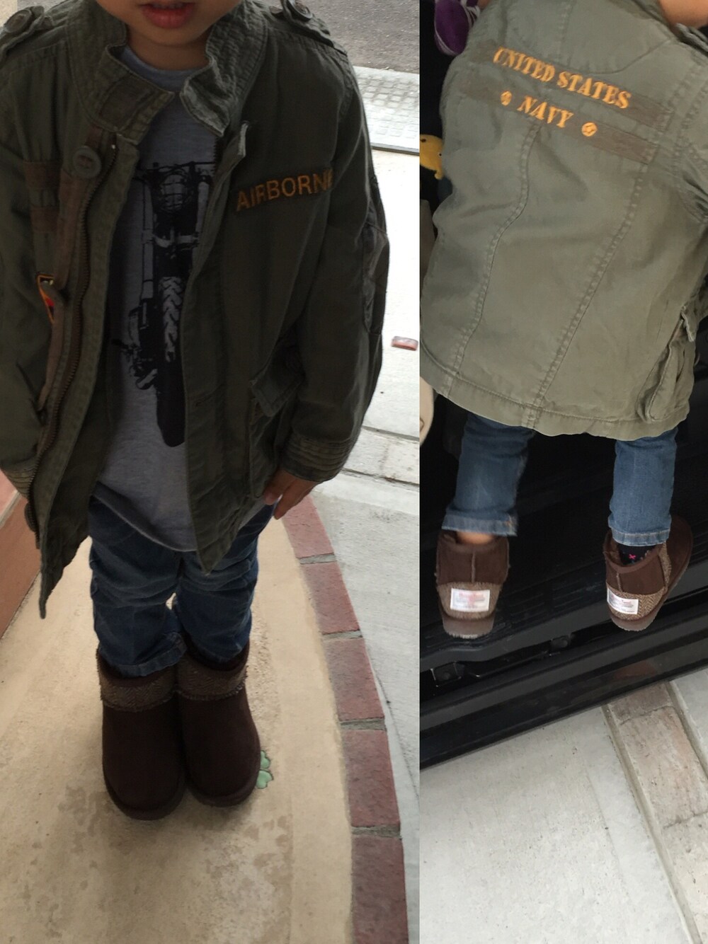 ちょっと背伸び、ワイルドコーデ 最近はメルカリ大活躍。 千円ちょっとで買えたジャケット、大きめサイズだけど腕が長い長男にはぴったりでした。 今日は寒いので親子でムートン履きました。 見ていただいてありがとうございます。