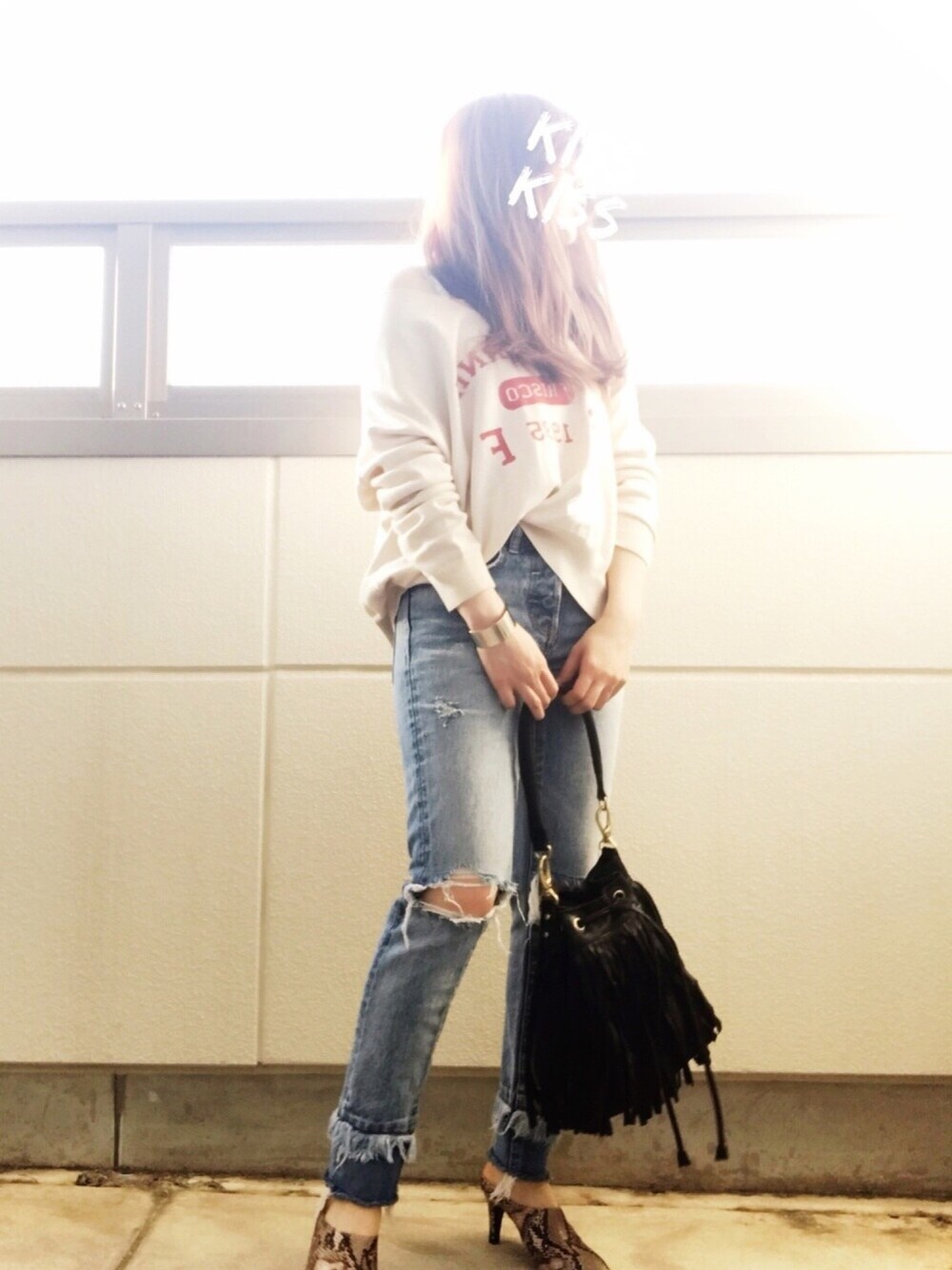 ご覧いただきありがとうございます❤︎ moussyのダメージdenimをアクセントに😃 カジュアルコーデ💋