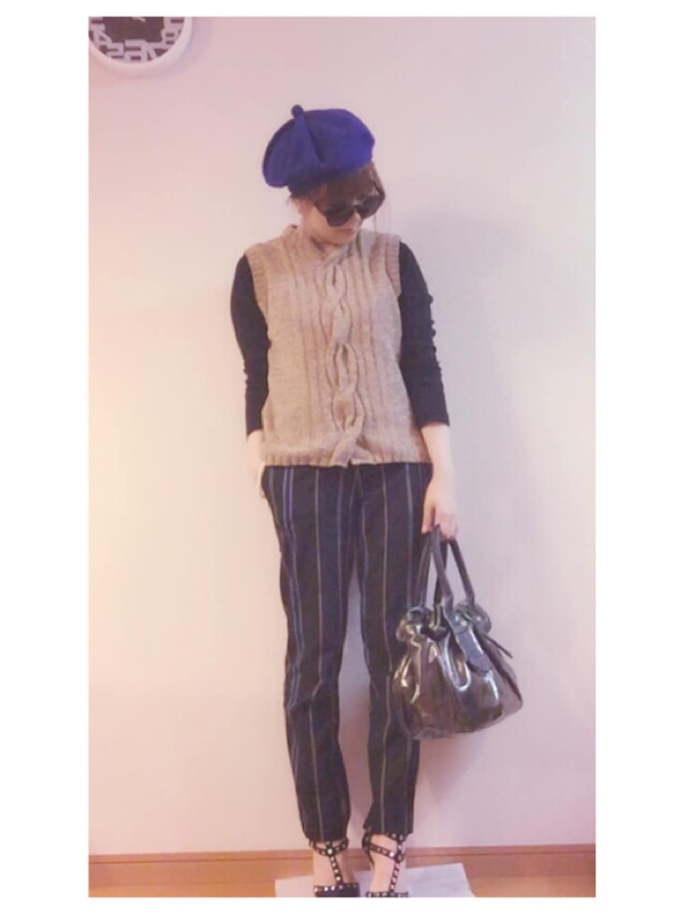 帽子とpantsのBlueラインで合わせてみました! ベレーがうまくかぶれない(つД`)ノ いつも苦戦します(^_^;)w
