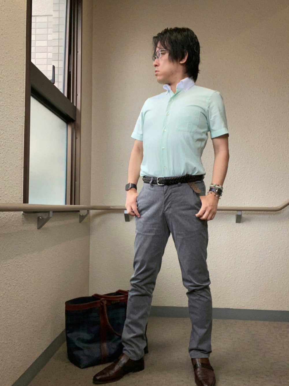 小雨が降る日のオフィスカジュアル 地面は少し濡れてるけど あえて革靴で攻めるのが自分流