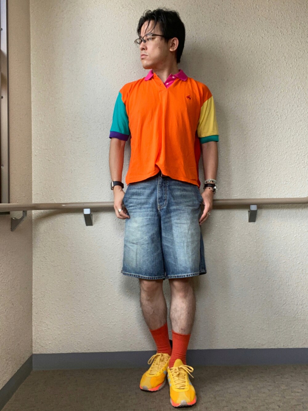 夏のお散歩ファッション ブルックス・ブラザーズの ポロシャツと ダメージが入った デニムショーツの組み合わせ クレイジーパターンの ポロシャツに負けない 黄色いスニーカーと オレンジの靴下の 存在感がミソ