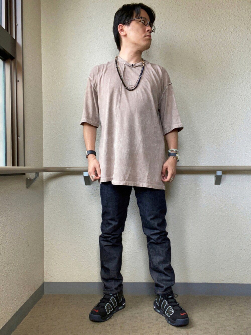 A'Gem9のビッグサイズTシャツを 使ったコーデ ブリーチ加工のインパクトが強い トップスに合わせて 下半身は黒&濃紺の シンプルな構成にしてみた 癖のあるデザインの トップスに合わせて スニーカーを 黒のモアテンにしたのは遊び心