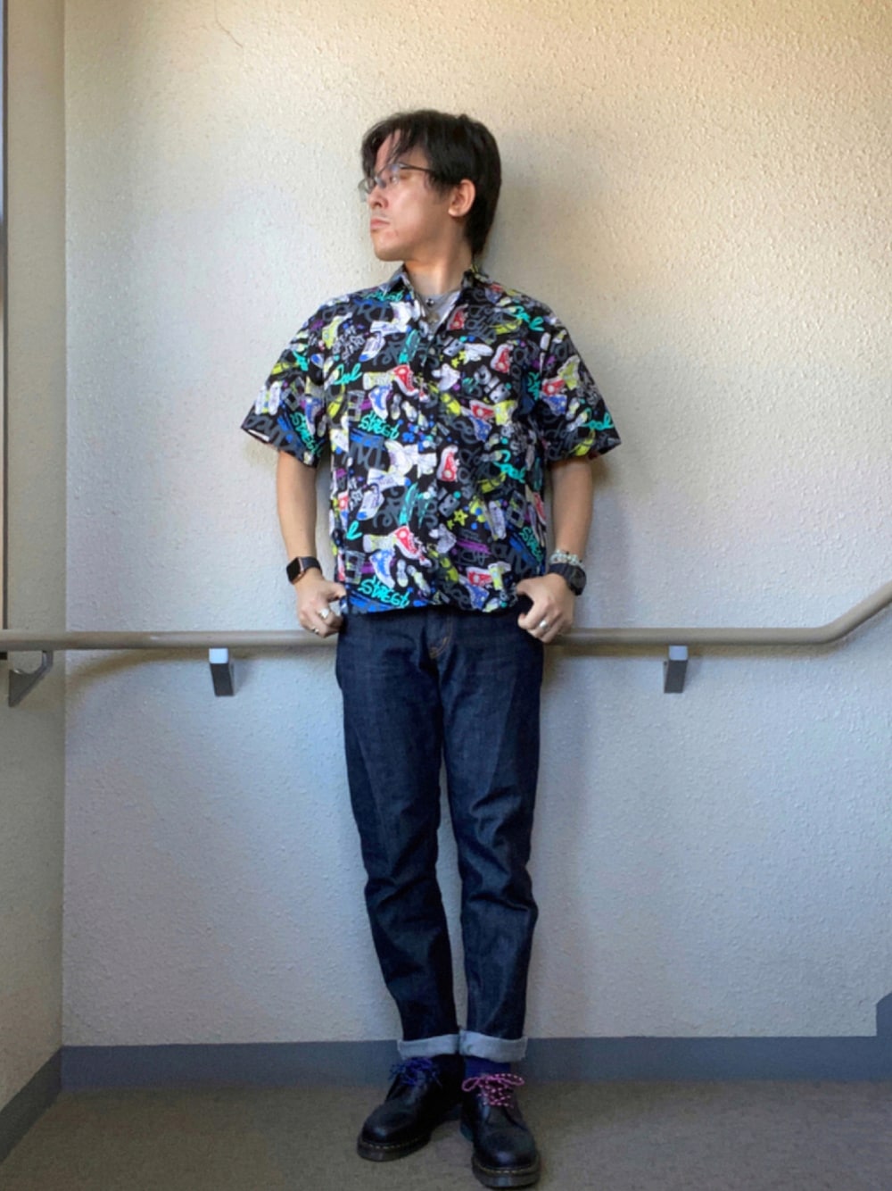 柄シャツとテーパードデニムの シンプルなコーデ 足元もDr. Martensの3ホールで 綺麗にまとめてみた