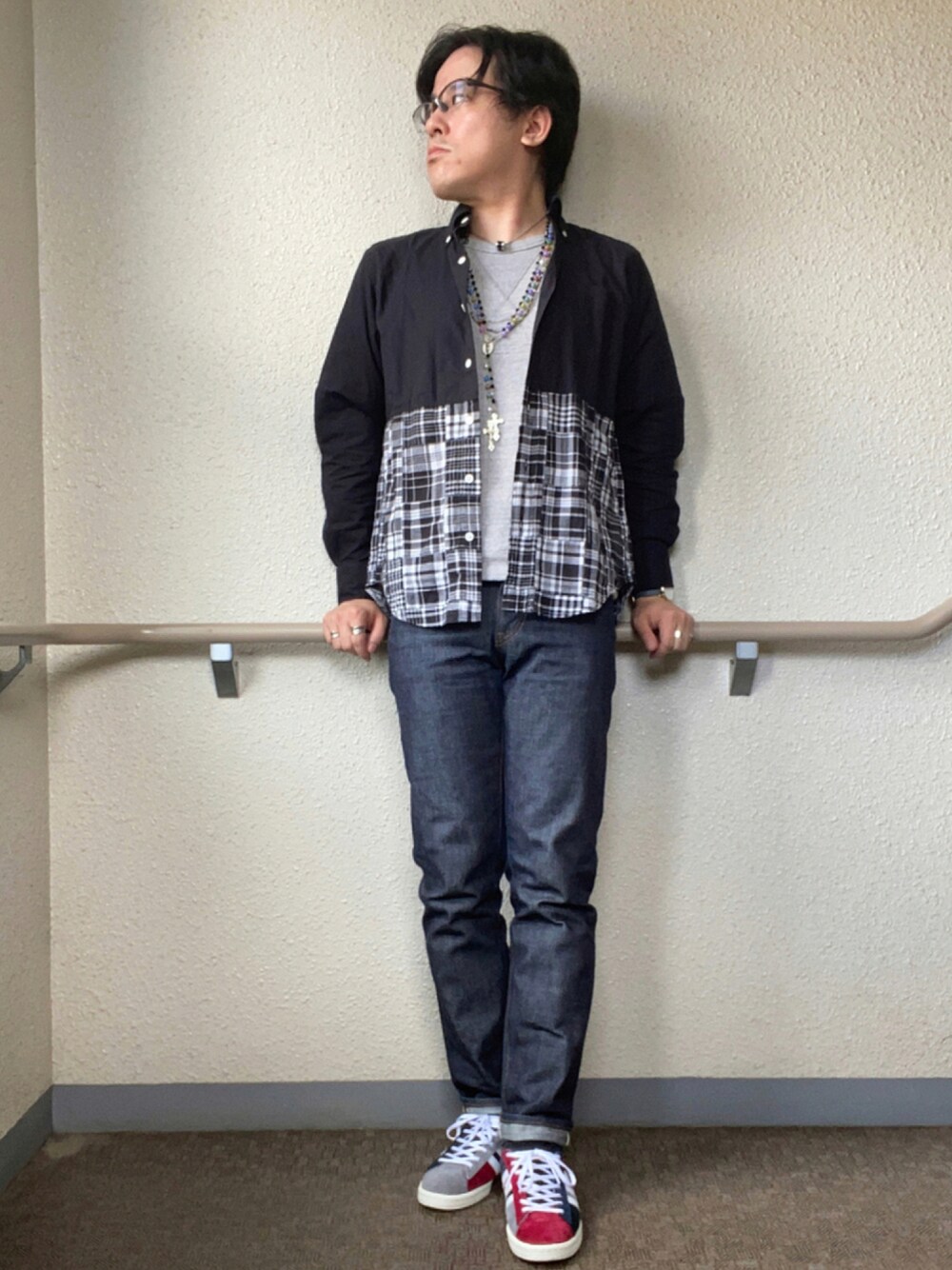 チェッカーず祭り2021秋後夜祭用コーデ Green Label Relaxingの マドラス柄シャツを軸に モノトーンっぽく纏めてみた モノトーンに偏りすぎても面白くないので スニーカーをクレイジーパターンにしたり ビーズネックレスやロザリオを重ね付け したりしてコーデにインパクトを与えたり