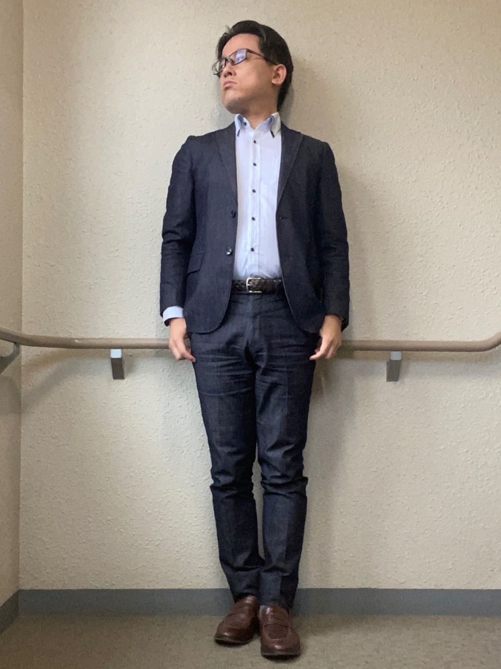 少し肌寒かったので デニムのセットアップを着て出勤 隠しアクセは黒パールの ネックレスで