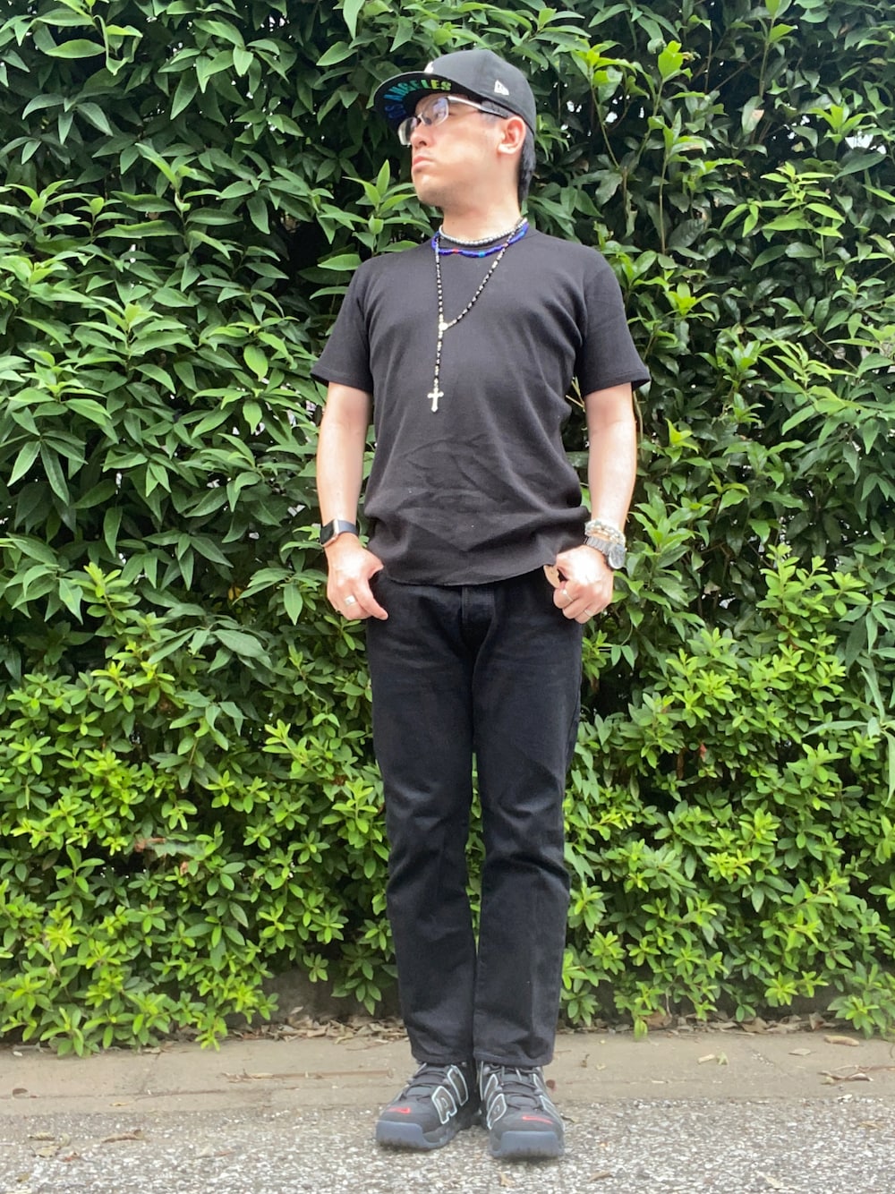 オールブラックのストリートスタイル サマーニットとデニムの質感の違いや 癖の強いモオテンを合わせてみたり