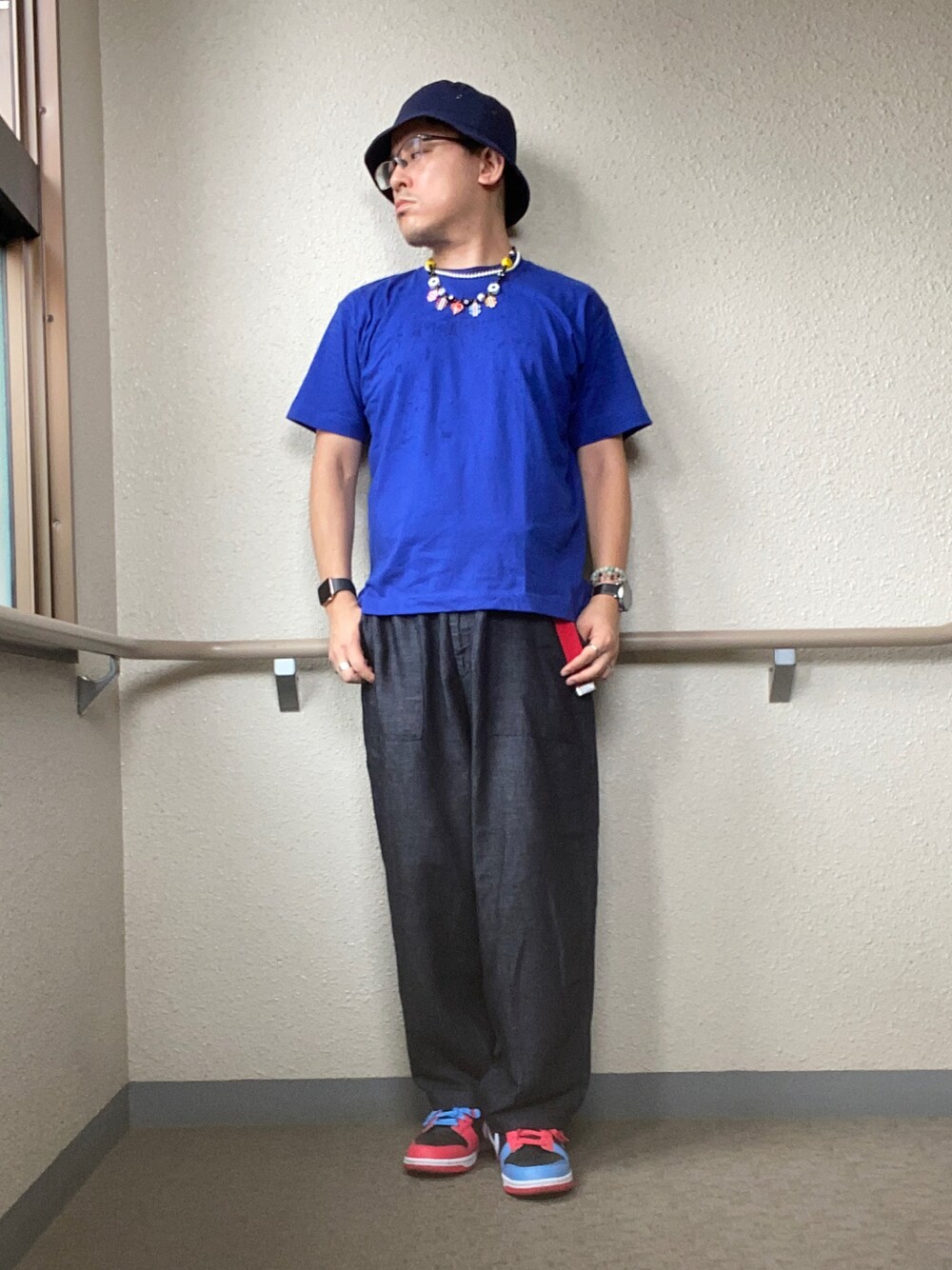 Tシャツとデニムのシンプルなコーデ アクセサリーやベルトに赤を入れて コーデのアクセントにしてみました