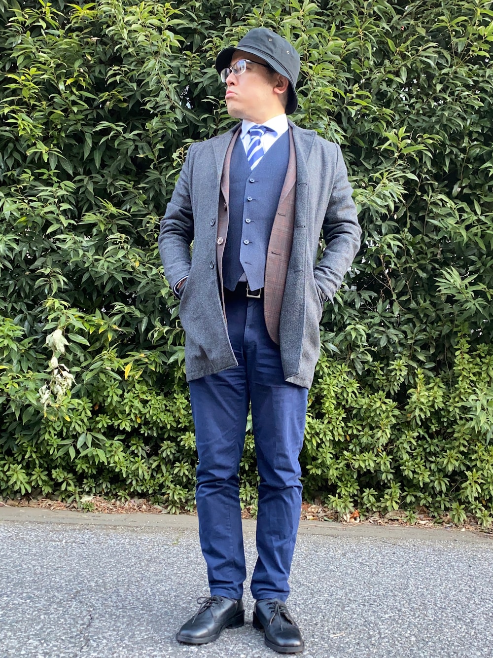 今日はネイビーのアイテムを多く使った 通勤コーデ 謎のイギリスブランドの革靴が 本日のチャームポイント