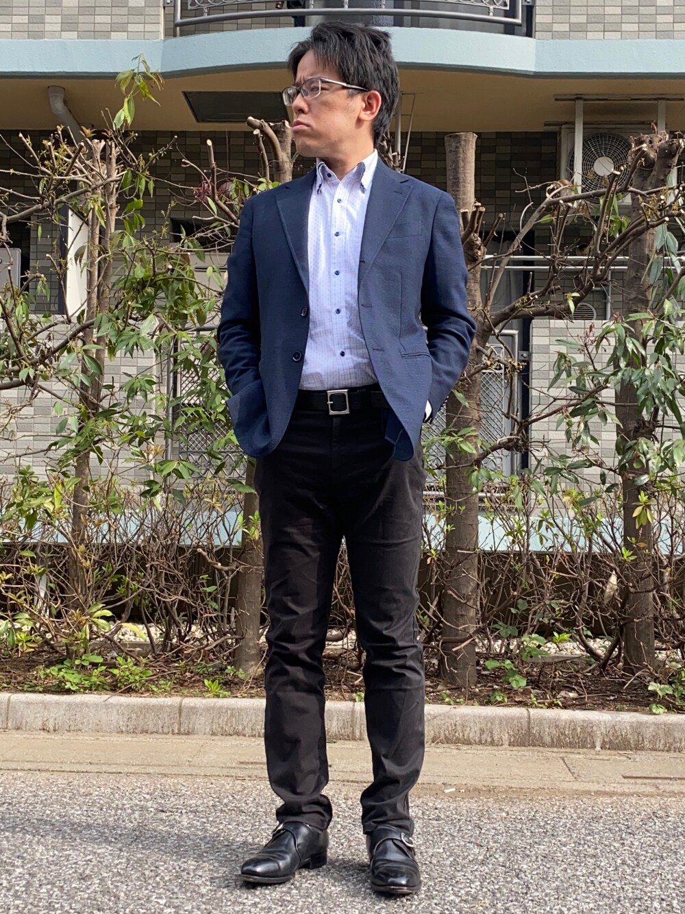 今日はネイビーのジャケットを使った ジャケットスタイル 靴も含めて、シックな色味のアイテムで 固めてみました