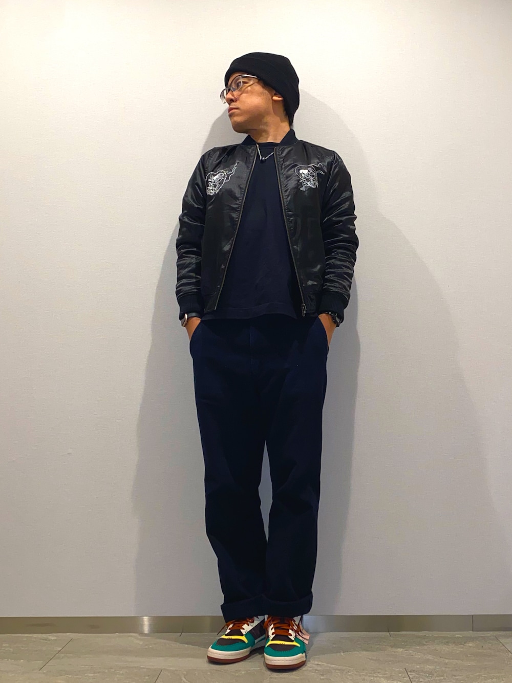 今日は黒いスカジャンを使った ストリートスタイル タイトな上半身と太めの下半身で バランスをとってみました