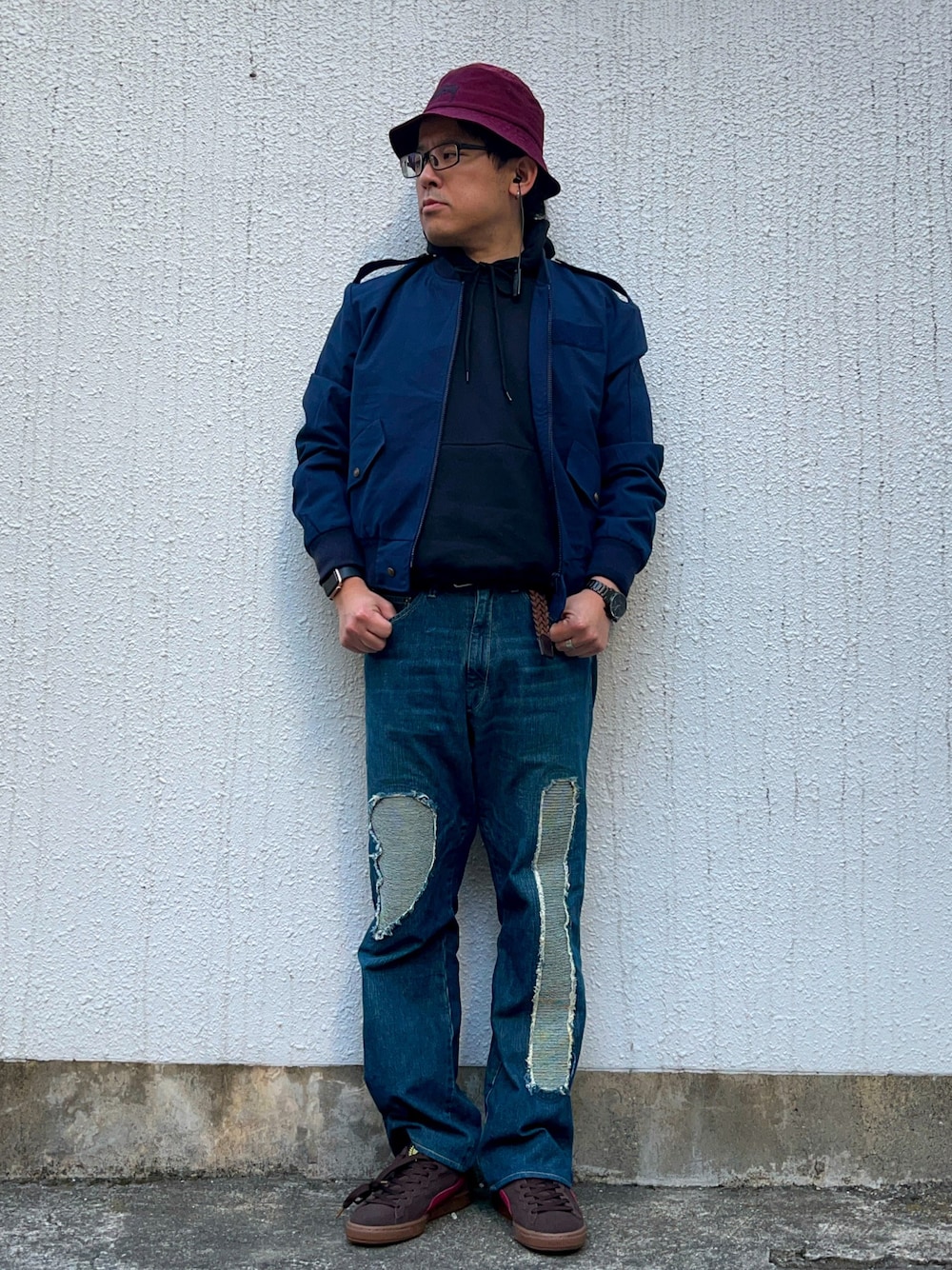 ミリタリージャケットを使った カジュアルなコーデ デニムの大胆なダメージが コーデのアクセントになってます