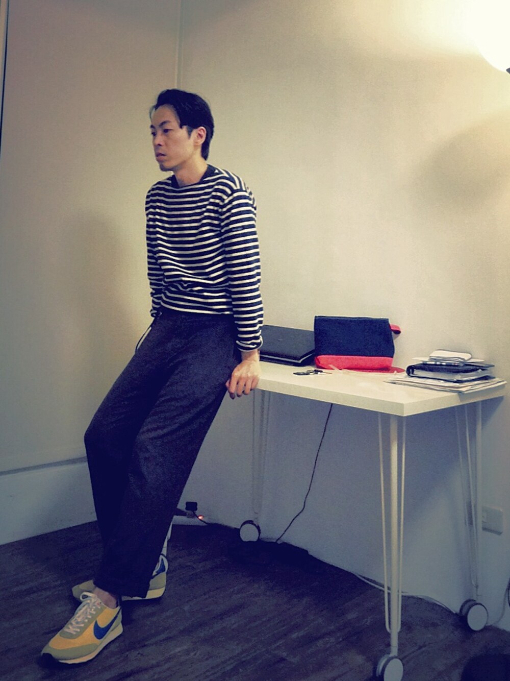 Top:Saint James Pants:Engineered Garments Shoes:Nike Too hot for today. I wear saint James border tee with my pants to show the blue tone style. Finish with my favorite Yellow Nike LDV Vintage. The match of blue and yellow is always the best. 最近什麼上衣都愛塞進褲子,T Shirt也不例外。