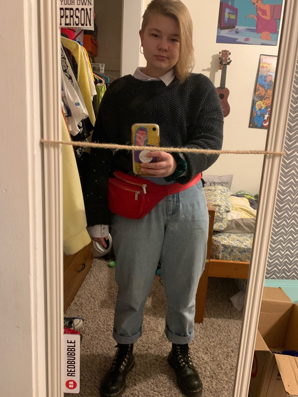2/10/20 I like this oversized sweater, especially with a button up under it. This button up is so light and comfortable. It’s my favorite one rn. Don’t really like these pants cause they’re too big and these docs are SUPER squeaky. It’s kind of annoying but they look so cool. 😭 Rating: 8/10
