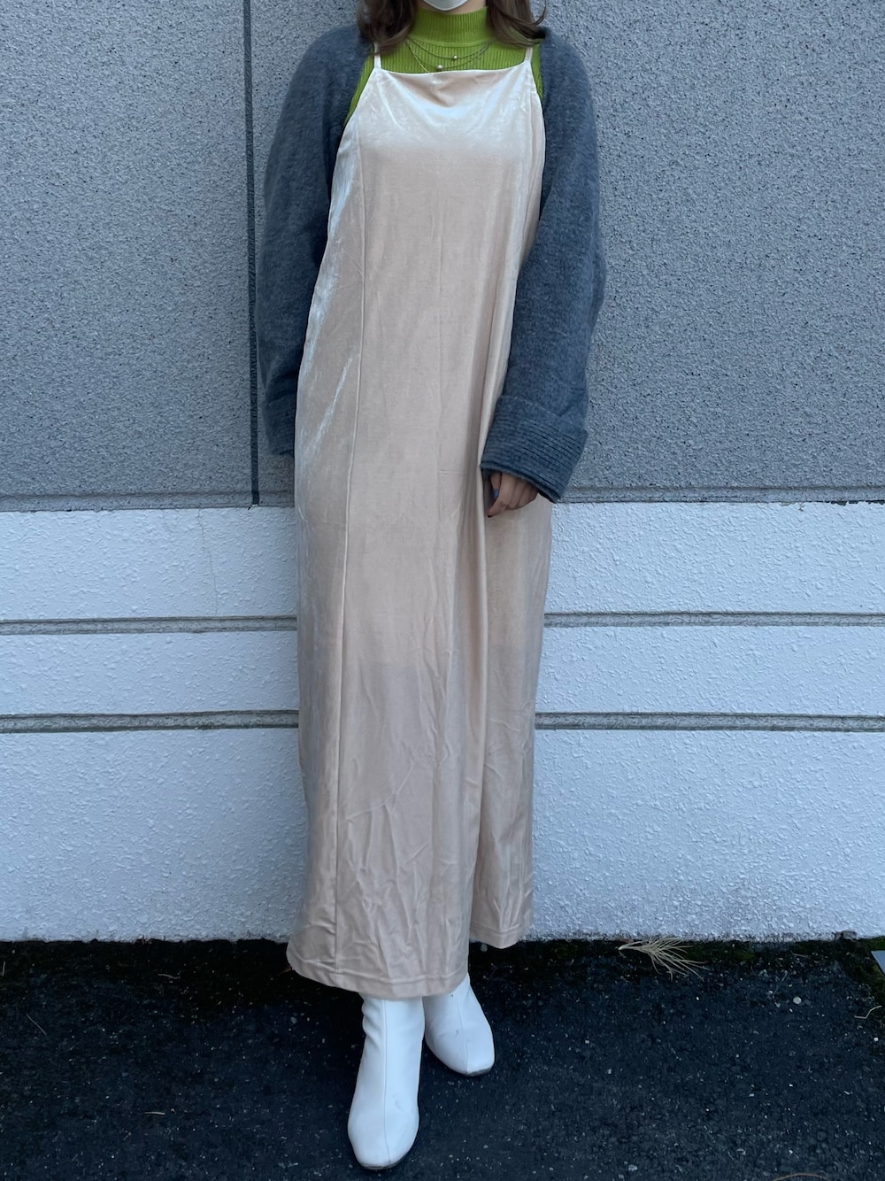 憧れの店員さんのところで買ったキャミワンピとボレロ このボレロはこの着方以外にもバラクラバとマフラーになるという優れ物 キャミワンピのシワは🤫