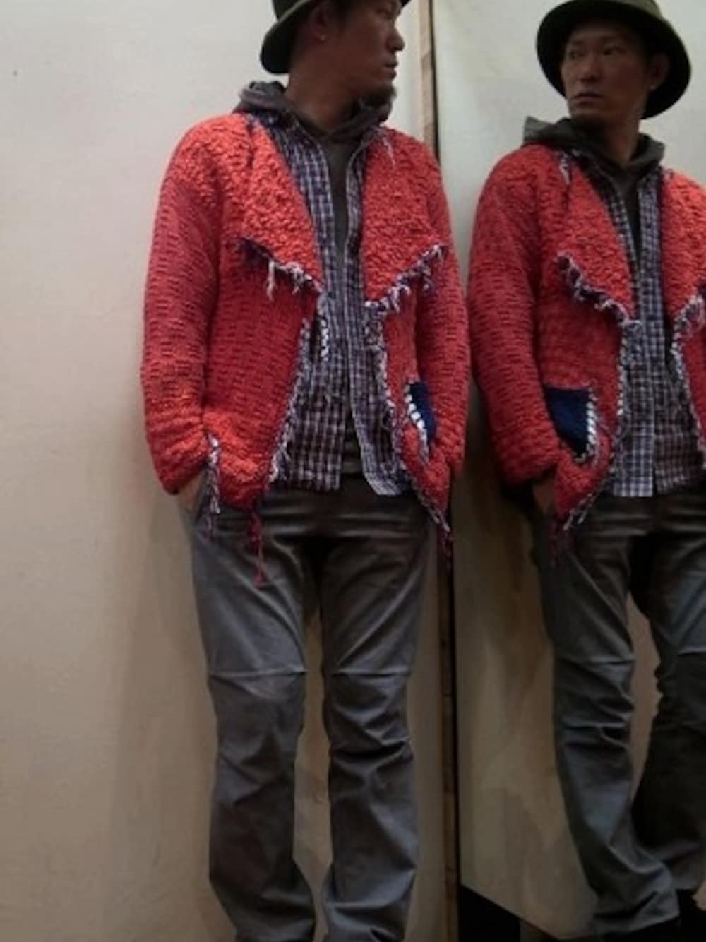 ●トップス:【Harapos Reales/ハラポスレアレス】 Frayed Cardigan(RED) ●パンツ:【ACTS/アクツ】 クライマーパンツ(Lサイズ) ●帽子:【Disce Gaudere/ディスケ ガウデーレ】 F/B フェドラハット(C.GRY) ●靴:【AREth/アース】 I velcro(ALL BLACK) ※180cm65kgでの着用サイズを記載しております。