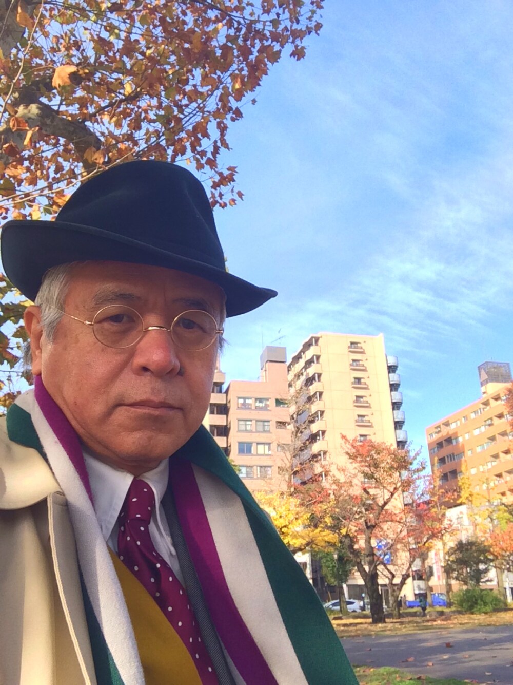 寒風の中での久しぶりの青空、 ウールのスクールマフラーで通勤コーデ❗️