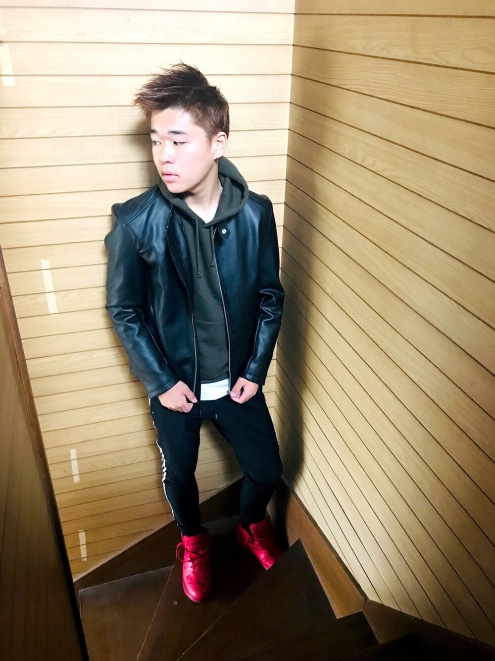 今日はライダースコーデ!☺️ ライダースにアースカラーのパーカーを合わせてシャツを着て、出すことで、モノトーンにアースカラーを一色足してるコーデになりまとまりが出ます!😆 ライダースといえば冬のど定番! 黒スキニーやジーンズとの相性抜群なのでぜひ合わせてみてください! 参考になる投稿を心がけていくので、フォローお願いします😊 Instagramもフォローお願いします🤲 @giichi_fashion