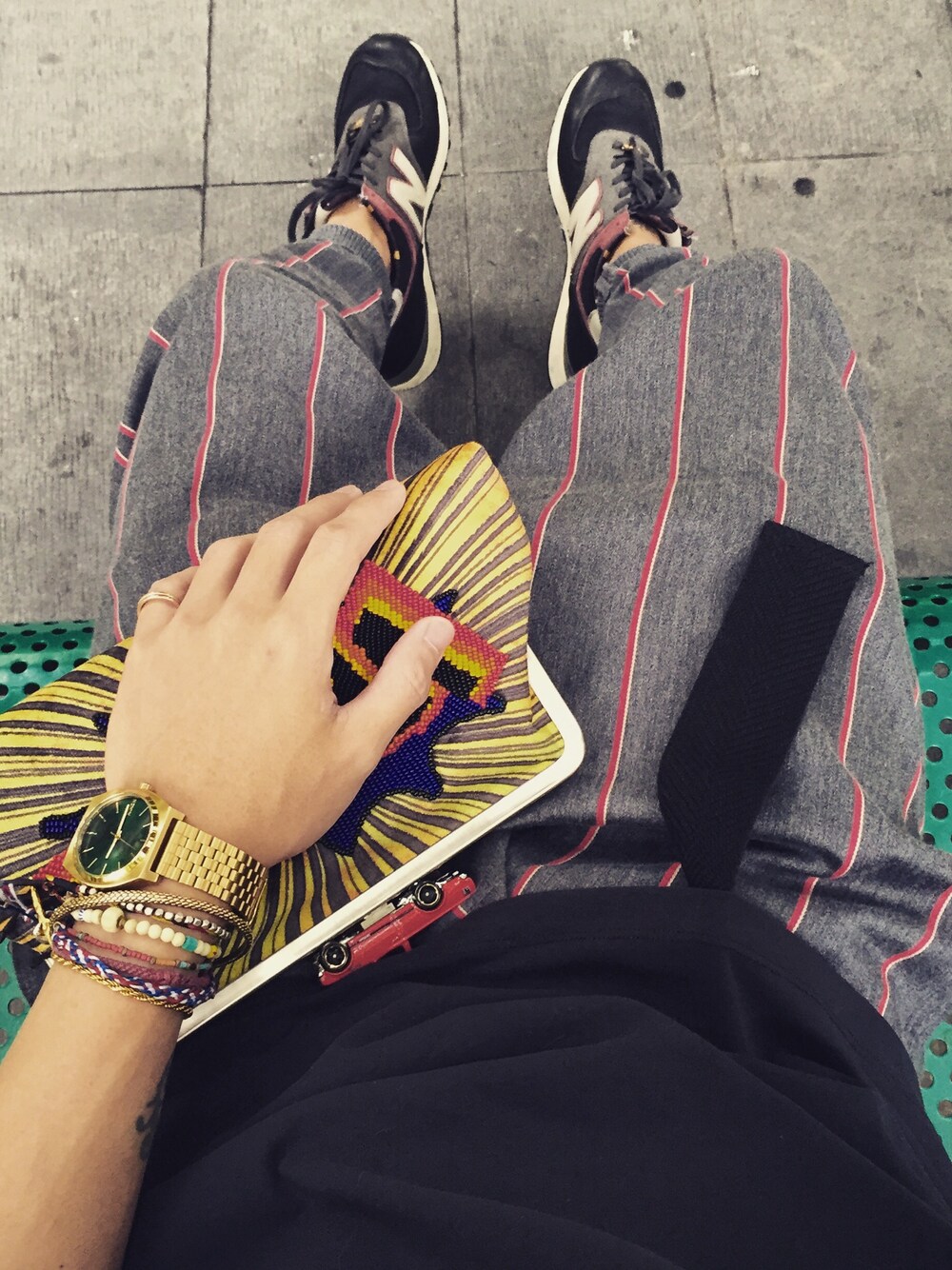 灰紅間條的哈倫褲,和鞋子顏色深淺呼應,搭配素色T恤,趣味性手拿包跳脫出彩。