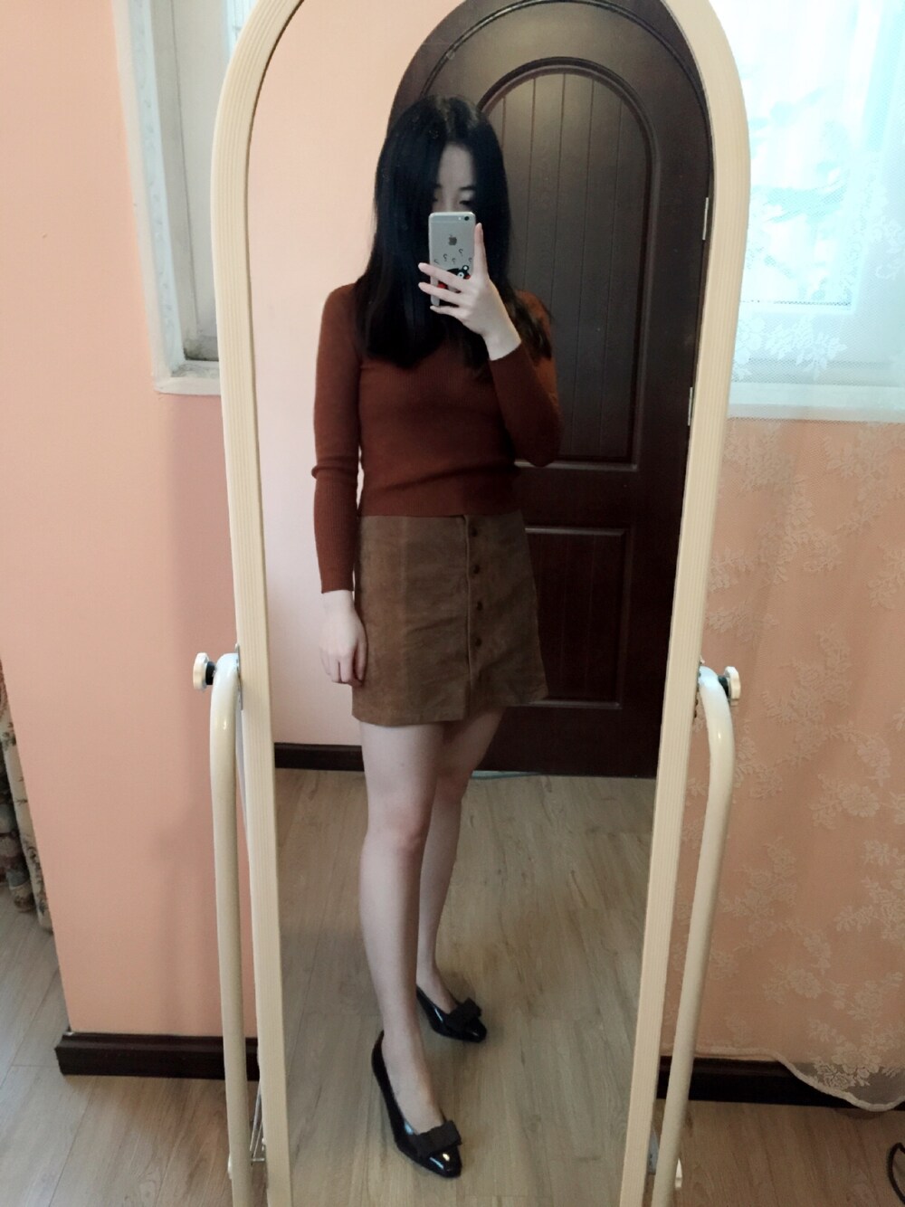 ブラウン系のパンプスを着用したレディースの冬コーディネートの1枚目の写真