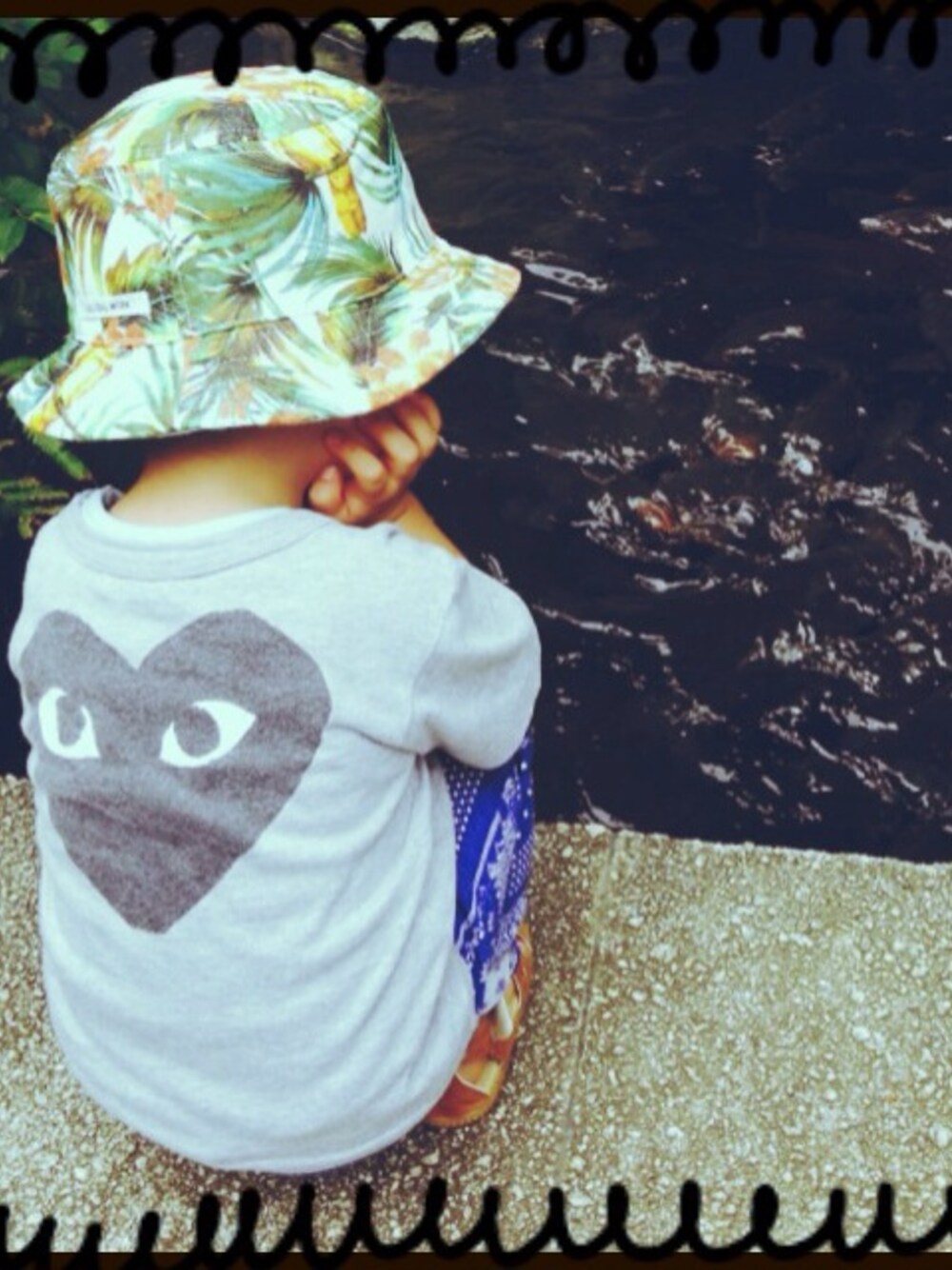じーーーっ。 サッカーもこれくらい集中して観ていただきたい。。 Tシャツ:ギャルソン パンツ:F.Okids サンダル:西松屋 ハット:グローバルワーク