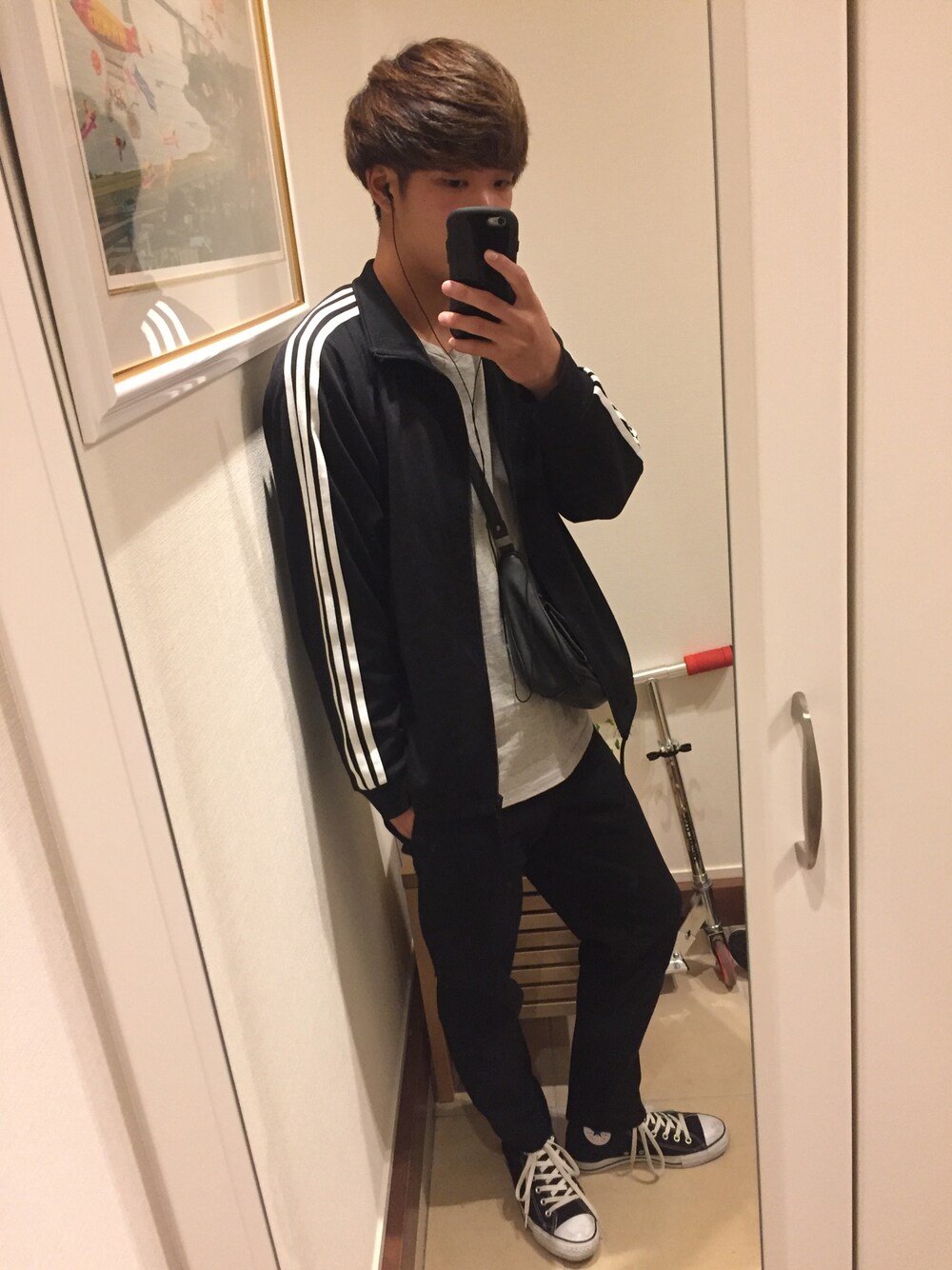 ブルー系のジャージを着用したメンズの秋コーディネートの1枚目の写真