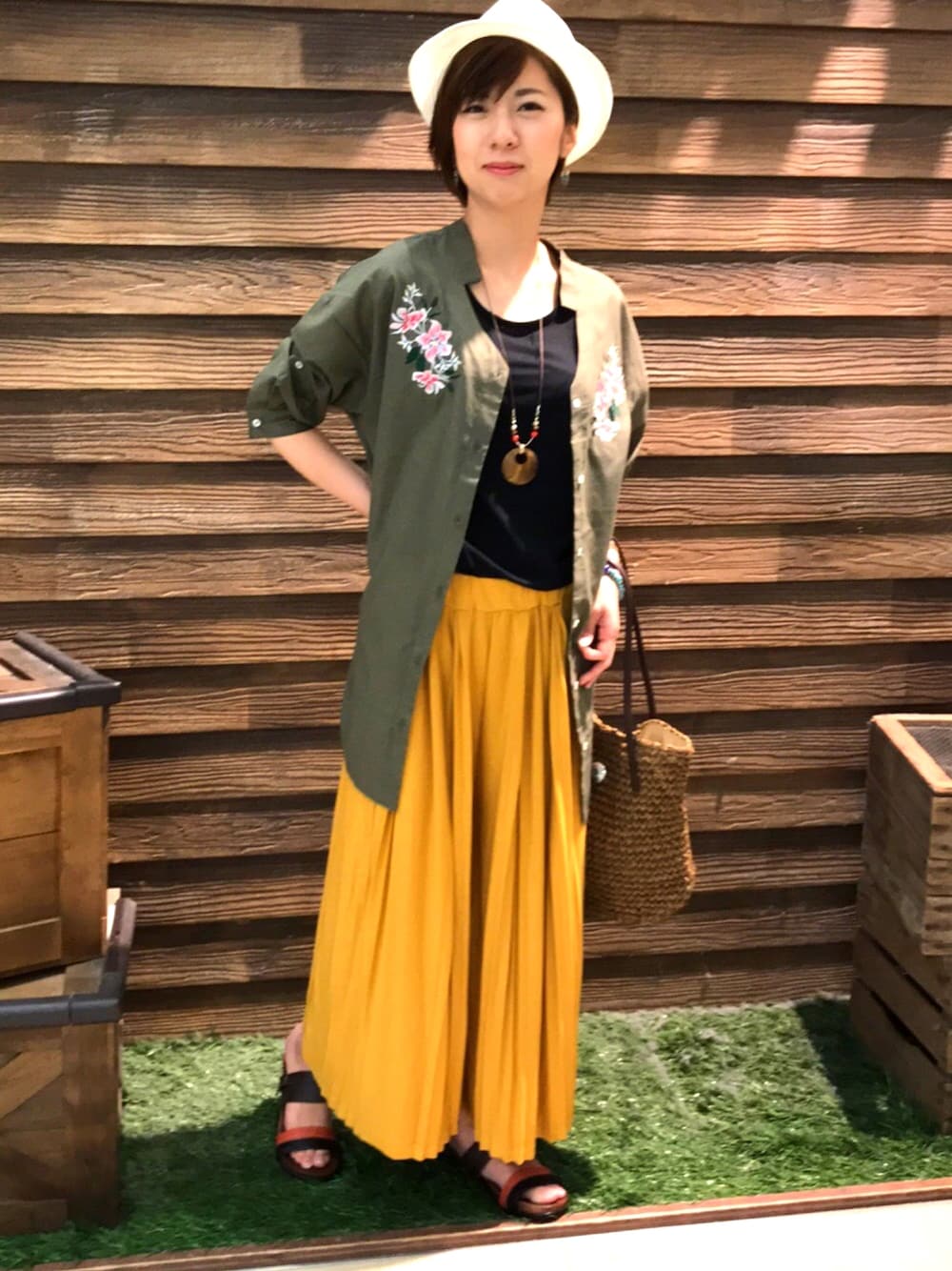 いいね、フォローありがとうございます😊 落ちついたカラーのカーキに、明るいイエローのスカンツで⭐️夏カラー⭐️にしてみました😄 タンクトップとシャツのセットです‼️ パンツをシンプルなデニムにしても使えますよ💕