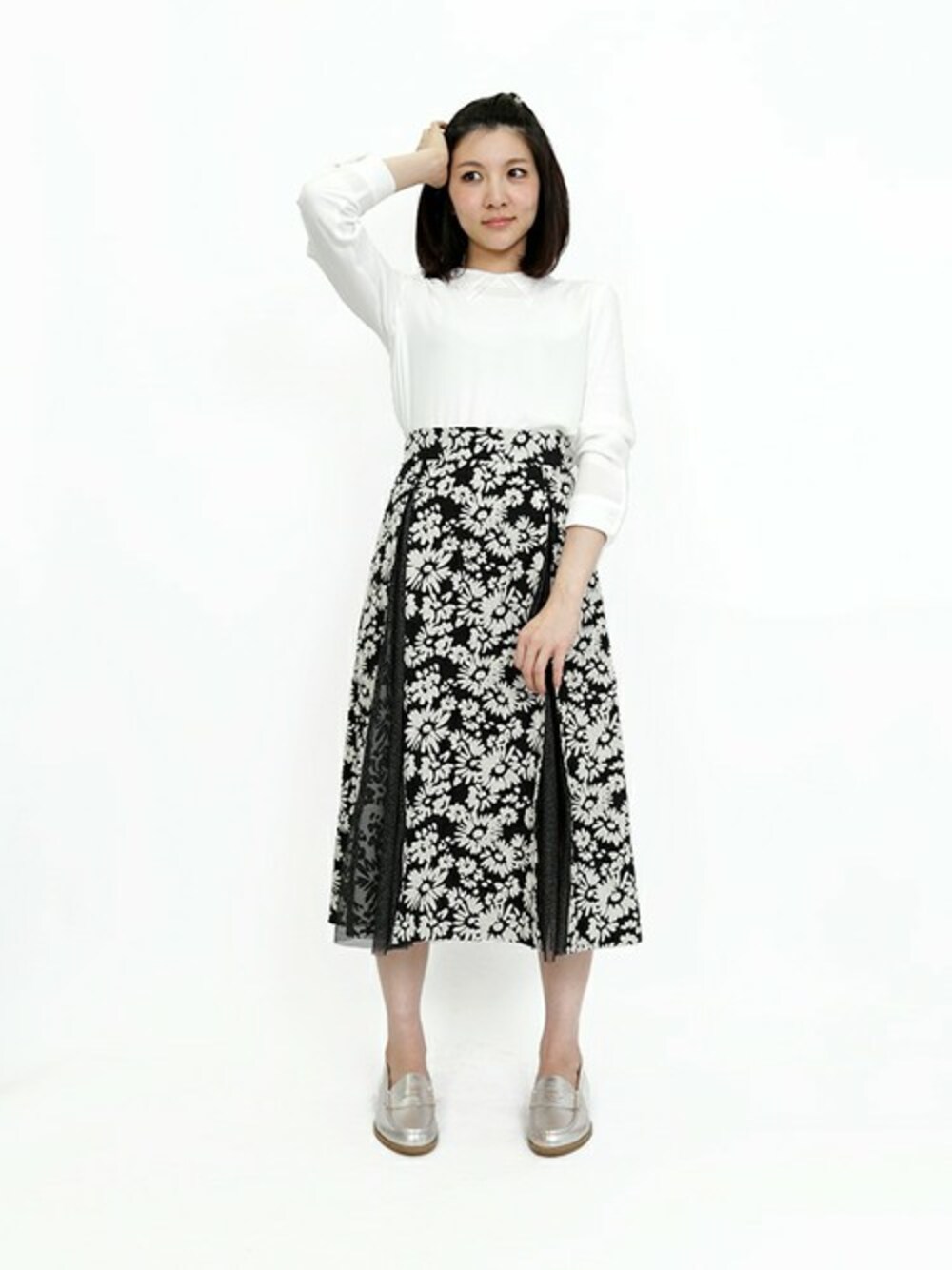 ジャカード織りで描いたフラワー柄が華やかなムードを漂わせるスカート。一部をシースルー素材で切り替え、涼やかさをプラス。ミモレ丈で今年らしい雰囲気に仕上げています