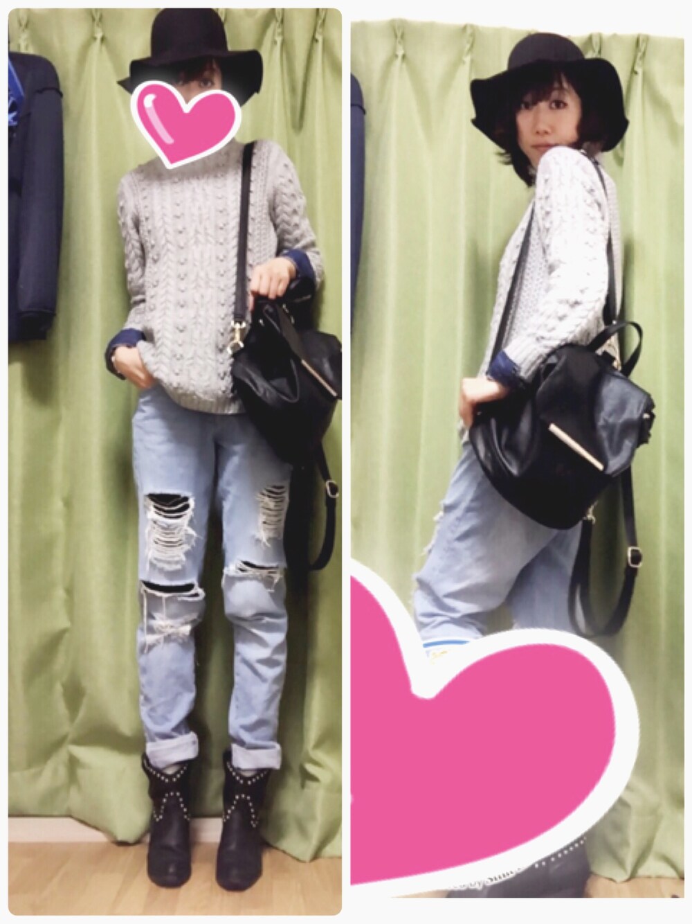寒過ぎて重ね着。。デニムの下に黒のタイツはいてます笑 早く冬が終わってほしいなぁー💦 ギャップのニットはシルエットが綺麗なのでかなり使えます😃 春物かいにいきたい💕