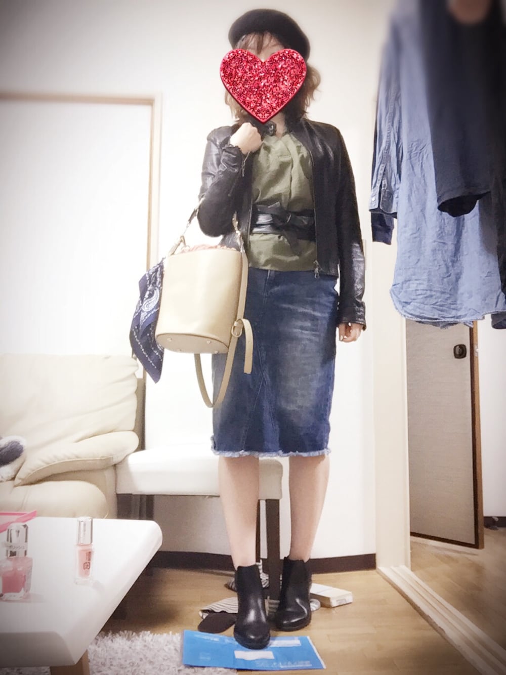 デニムスカート着回し 雨の日はレインブーツ
