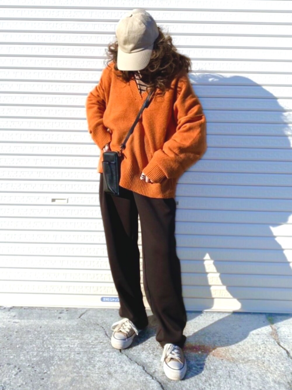 こんにちわ☀️🌳❄️ いつもありがとうございます🙋♀️✨ __ コーデ 👗 オレンジ✖️ブラウンコーデ🍊🍫 angie さんの 🟠 オーバーサイズ 深Vネックニットプルオーバー オーバーサイズのトレンド感あるニットが 可愛くて今回はメンズライクに合わせてみた👖✨主張しすぎないオレンジカラーで合わせやすい︎👍🏻 💘 深めのVネックでロンT入れたりいろいろレイヤードしやすいし、着回しもききそうでお気に入りです🫶🏻❤️ いつもいいねやセーブ嬉しいです🫣💕 ありがとうございます🙇♀️