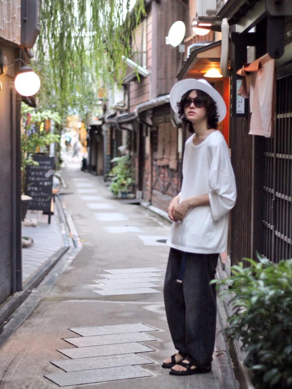 DOG京都店でのスタイリングです。 ゆったりとしたシルエットを保ち、ストローハットで夏っぽさを出してみました。