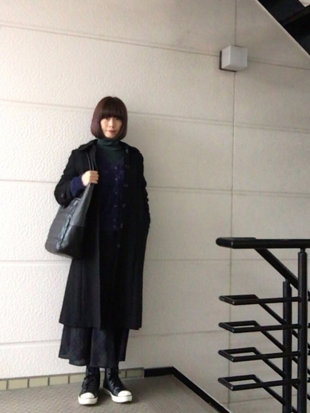 乙です٩( ᐛ )و ✩**・ ロングコートは母親のお下がりっ。 とても昭和なレトロなコートです。 すんごく可愛くて気に入ってます(^ ^)♡ コートの中はグリーン×ネイビーです♡ スカートはブラックウォッチ。 schottのトートバッグ、大活躍してます(^ ^)☆ マーチンの8eyeあげちゃったのでコンバースのエヴォばっか履いてます。 柔らかい皮の8eye 欲しいなぁ(´・_・`)
