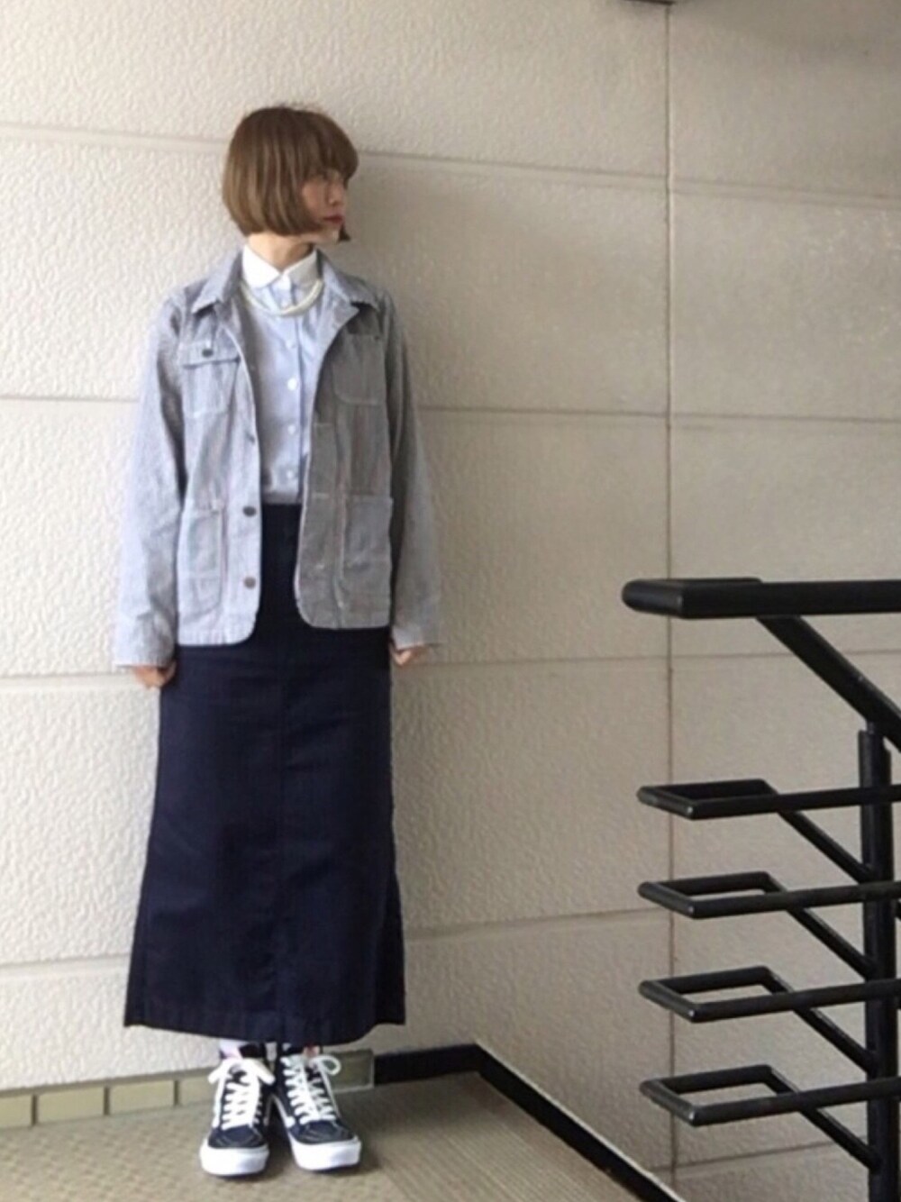 乙です٩( ᐛ )و ✩**・ 春はカバーオール活躍しまくりっ。 X-girl のカバーオールはヒッコリーで春らしいっ♬ ヒッコリーにネイビーのスカートとシャツの色がとても合ってて綺麗なのに写真だと分からないのが残念っ(´・_・`) 淡い色のカバーオール着てるように見えるよねぇ。 スニーカーはおぬぅのVANSのハイカットでネイビーね♡ ネイビー大好きです♡