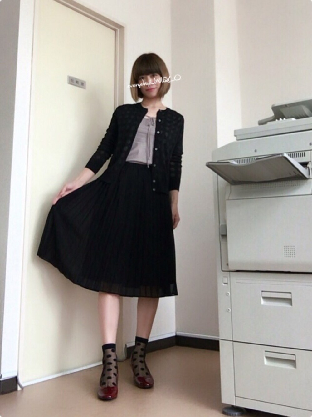 今日のUNIQLOはシフォンプリーツスカートです(o'∀'o)ノ 何度も言いますが、このシフォンプリーツスカート優秀です。 プリーツスカートの何が気になるかって腰の部分でプリーツが広がってしまうことがイヤ!!! でも、このスカートは広がることもなくキレイなんです(´^ω^) もう売ってませんが(;´д`)ゞ 私が買った時はセールで1000円くらいだったけど、その後、更に安く500円で売ってました(≧∇≦) 今、売ってる似たようなスカートよりハラハラと揺れるし透け感なんかも違います。 して、今朝は寒かったので長袖カーディガンです。 これ、織り方でドットが透けて入ってます(´^ω^) たまらんね、こうゆうの(*'∀'人)♥*+ 足元はシースルーソックス~♡ これまたドットです(♡_♡) これオ気にです。 パンプスは楽天で2足5000円?だったレインパンプス☆ これがけっこー活躍してくだるんだな~。 ワインレッドのエナメルです。 梅雨明けまだですかね? んまぁ、雨音を聞いてるのは大好きですけど(^ ^) スカパラ×甲本ヒロト氏の「星降る夜に」大好きです♪ ♪あ~めっ ふ~るっ この季節は きっ~と♪ ♪ゆ~めっ まだ 叶ぁえら~れぇず ♪ あ!髪切ったんですけど、気が付く方いるのかなぁ~(゚Д゚ ) カラーはアッシュブラックなんですが、これまた10日程で落ちるんだろうなぁ・・・。