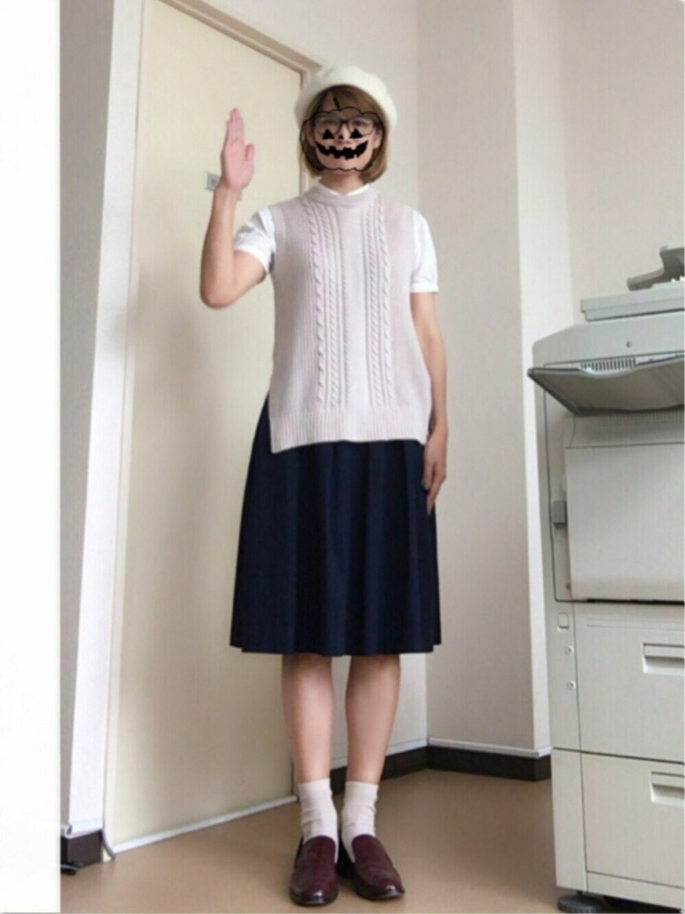 今朝は仕事の事を考えていてカッコの事を考える余裕がありませんでした。 ん?誰ですか? 仕事してるんですか? いつも仕事ってカッコしてないじゃないですか(゚Д゚ ) って言ってるのは ☇☇☇ಠ_ಠ と、言うわけで maruちゃんが可愛いカッコをしてたので真似することにしました(´^ω^) でも、同じお洋服は持ってるわけもなく。 ニットベスト、ベレー帽、を装着☆ して、私はローファーを持っていないのでオペラシューズで代用。 ポーズも真似してみました。 ウソデス・・・(*´Д`*)
