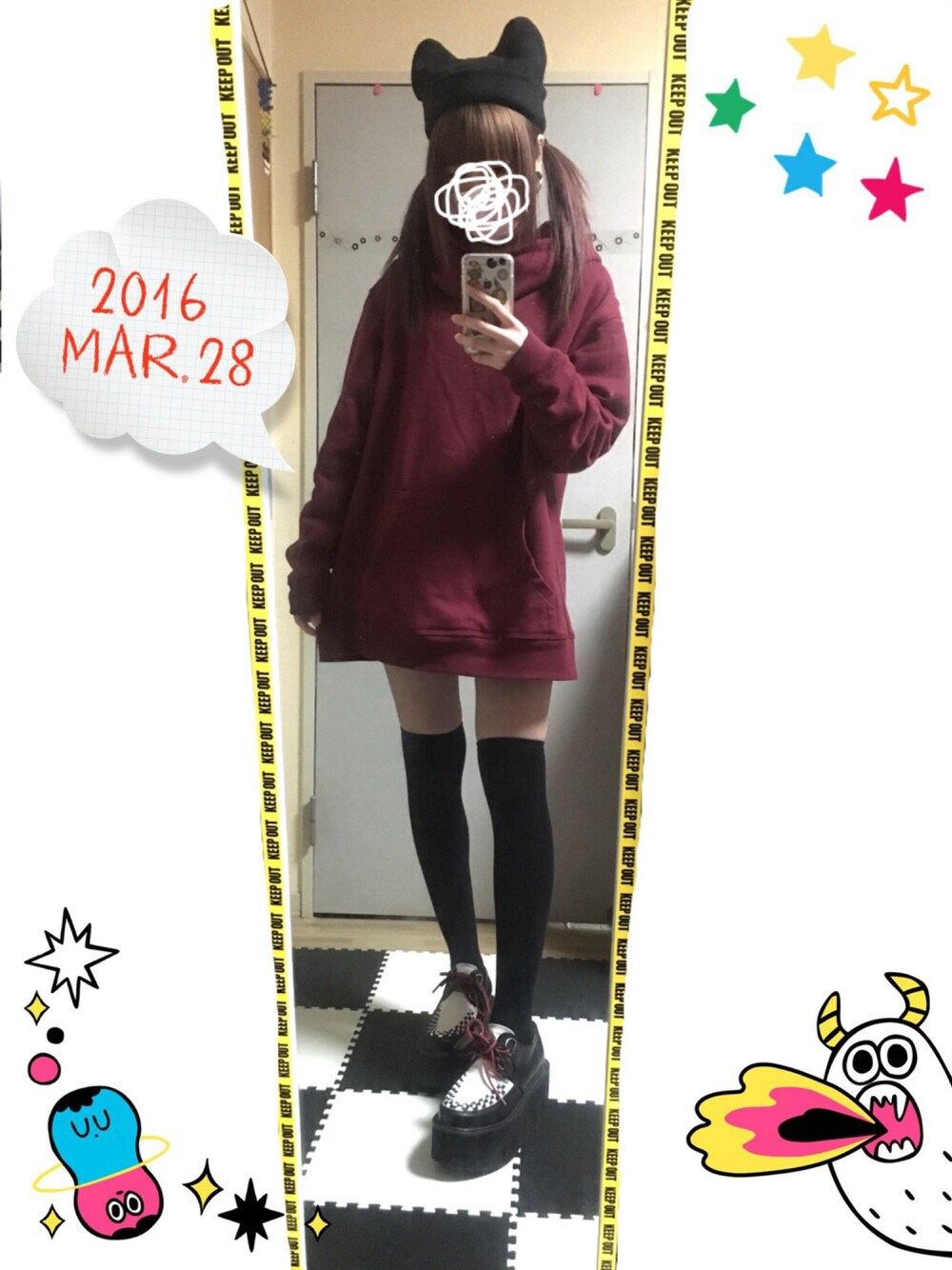 3/28 ニーハイ久しぶりに履いた。。 髪の毛セットするの面倒だから "とりあえずニット帽"作戦…。゚(゚^ω^゚)゚。 とてもシンプル