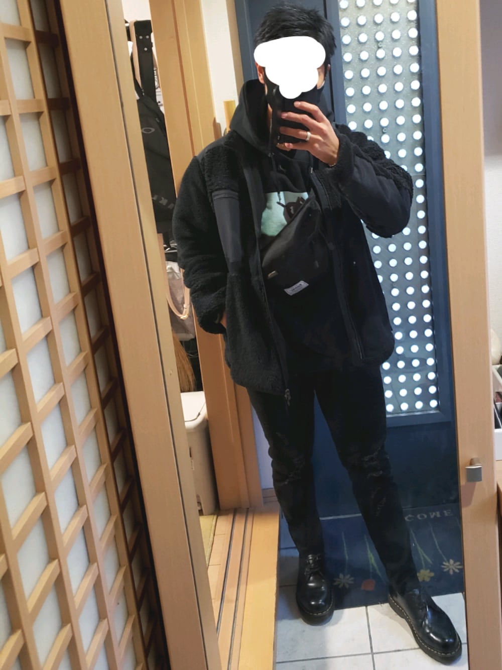 Herdenのパーカーとパンツを使ったオールブラックコーデ