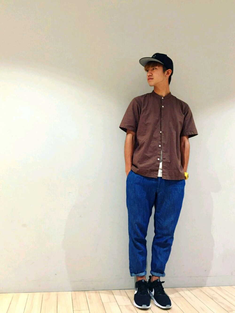 全体的に3色でまとめながらも内側から白の爽やかさがでてるかな?笑 上のシャツを脱いでTシャツスタイルでも行けますね♪ パンツは今流行りのゆるっと💥💥 見た目はジーンズみたいですが材質は麻で出来てますのですごく涼しい👏✨