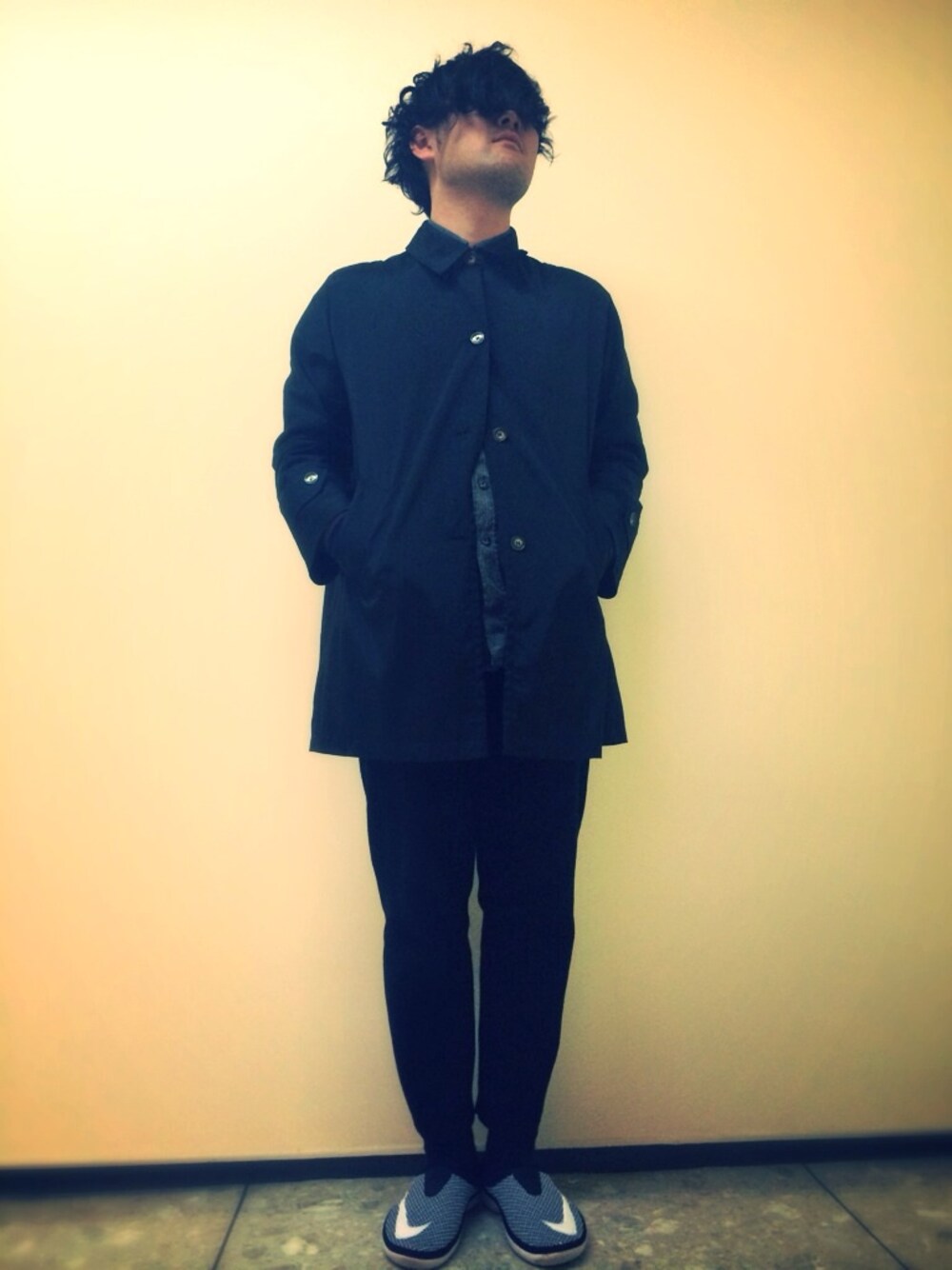 モードな気分の1枚。 黒のスプリングコートを上2つだけしめて、下のシャツをチラ見せ。 黒のニットパンツはcrepuscule。 さすがの仕立てです。 ニットパンツは初の展開らしく、超長綿を使いミラノリブにしてるみたいです。 生地も重く、下にストンと落ちるのでシルエットもめちゃくちゃ綺麗です。 そして、NIKEのサンダル。 サンダル、パンツとめちゃくちゃ楽に履けて、全体を綺麗にまとめる事ができました。 オナシャス。