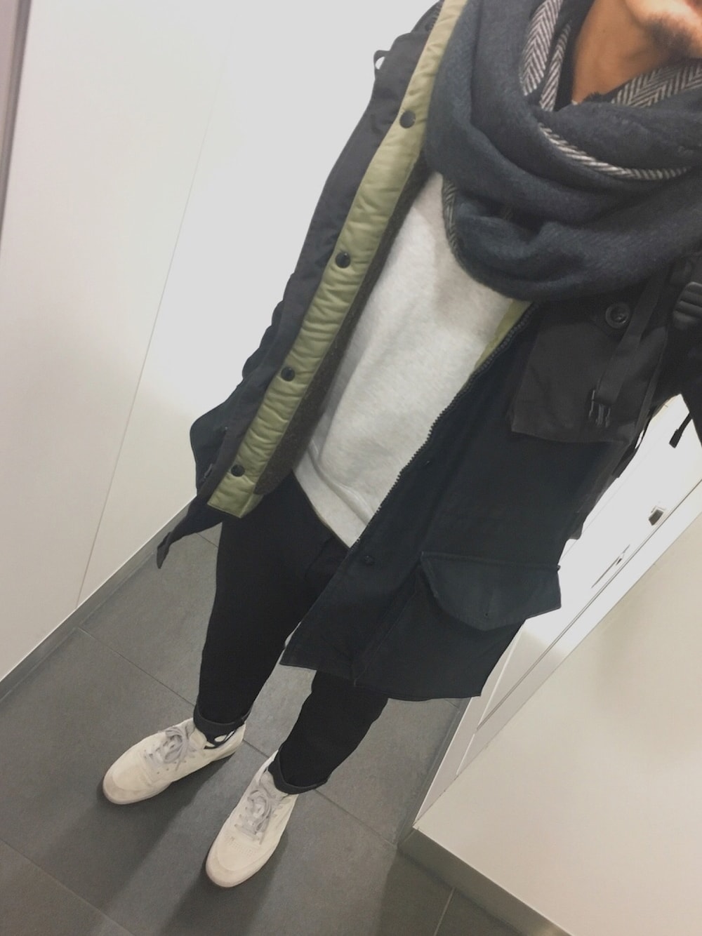 いつもこんな感じで出社してます。エンジニアなのでオフィスでの服装は自由度かなり高いです。 シンプルにモノトーンのつもりが、M65のライナーが図らずも差し色っぽい感じに。