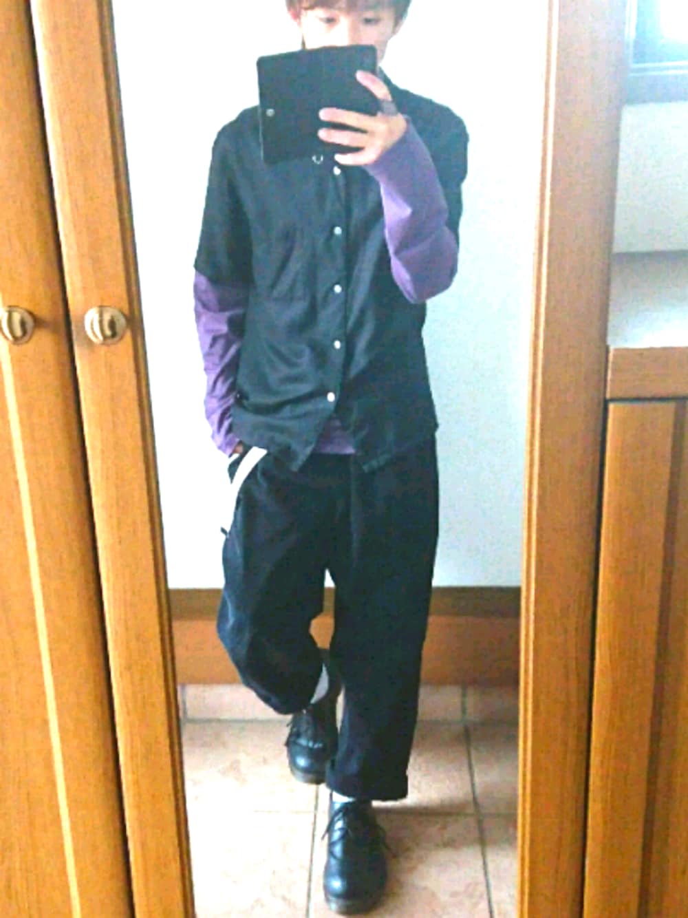 靴はマーチンではなくマーチンに似た安物です お金がないから買えない… 最近パープルがはやっているのではやりにのっかってみました ケータイで見えないですがタートルネックになってます 親には中学生のヤンキーみたいと言われましたw