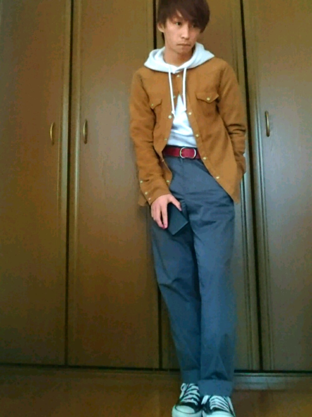 今日はあんまり着ないパーカーコーデです。 顔が変なのは気にしないで下さいw 寒くなると白着たくなりますよね! 個人的に白のBIGパーカーきてる女子すごい好きですw 茶色とグレーでちょっと地味になったのでベルトの差し色で赤いれてみました 兄にもらった茶色のノーカラーシャツはスウェード素材で触り心地がいいです コンバースはほんと万能ですよね! もう少しすそ上げして見せたほうがよかったですね…