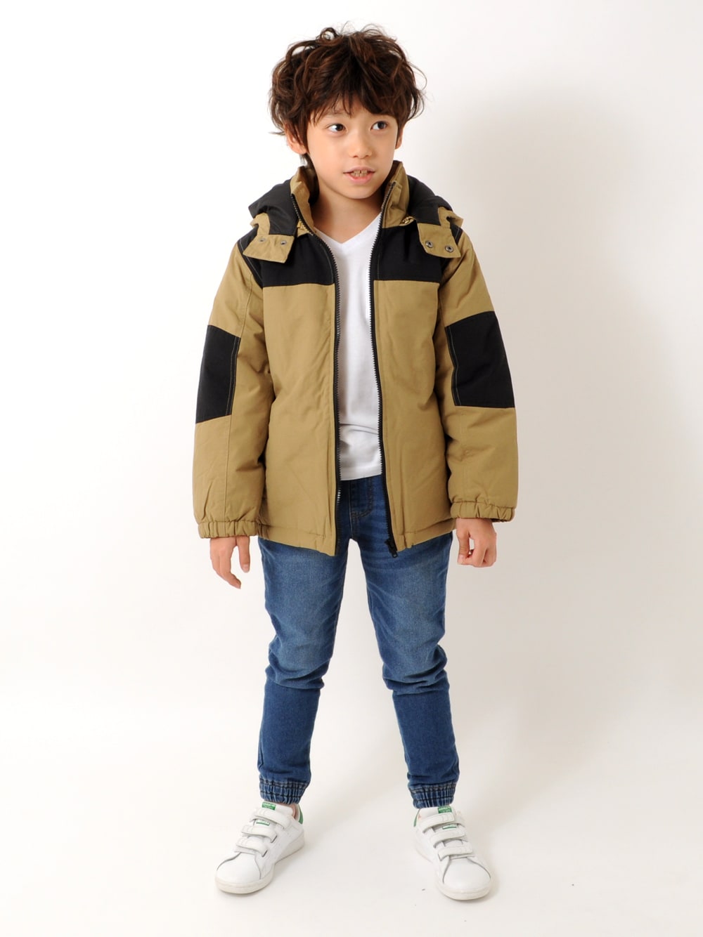 ベージュカラーと黒の配色が秋冬らしいアウタースタイル。 アウトドア系アイテムによく使われるC/Nクロス(コットンナイロンクロス)を表地に使い、ふっくら軽い綿が厚めに入ったボリュームのあるアイテムです。