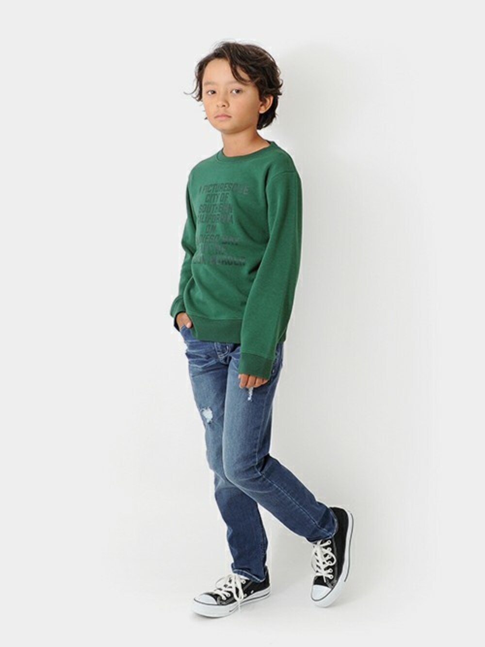 プリントトレーナーとデニムを合わせた定番カジュアルコーデ★同色系のプリントカラーなので、主張しすぎず大人っぽい雰囲気に◎
