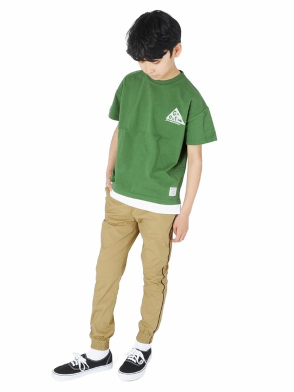 着るだけでレイヤードスタイルが完成するトップスは、 コーデに抜け感を演出してくれます◎ 鮮やかなグリーンとベージュのパンツで春らしい色合いのコーディネートに♪